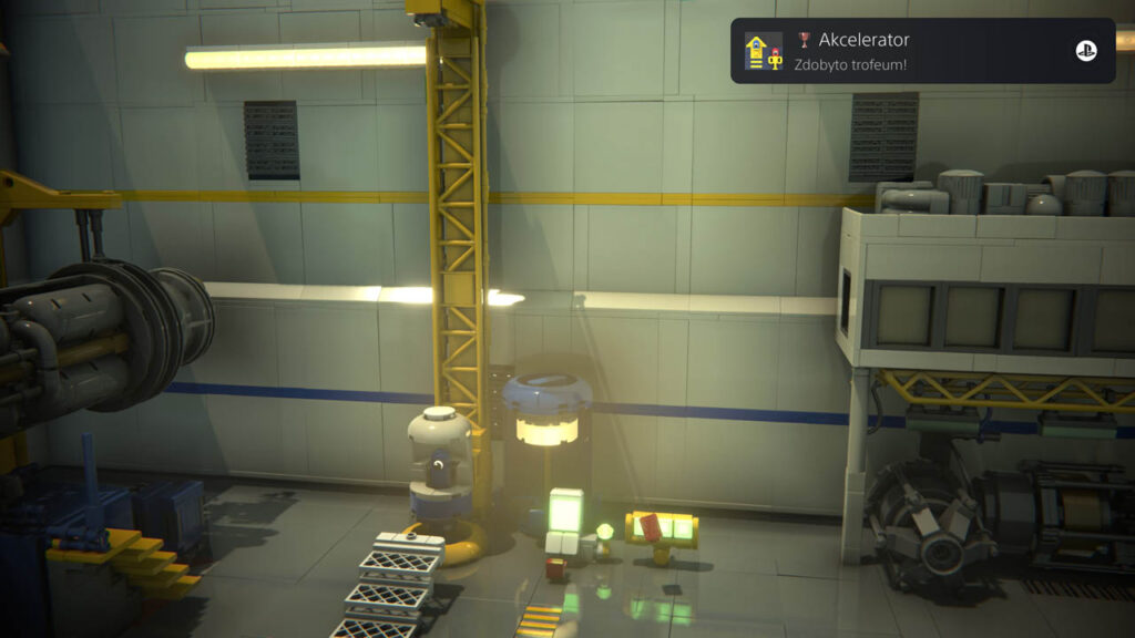 Ten sam, 33. rozdział. Wskakujemy do poniższej maszyny, nasz kompan musi ułożyć konstrukcję z klocków w taki sposób, by po odpaleniu maszyny nas nie zwiało. Po zaliczeniu testu wpada pucharek.